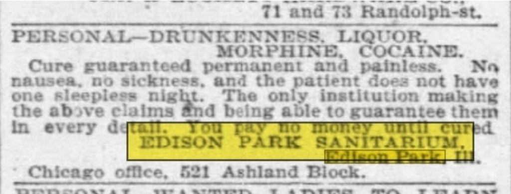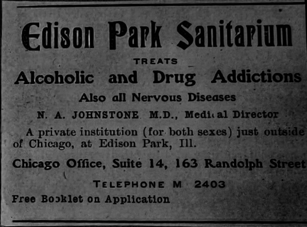 Streets were once lined with fruit trees and evergreens that sat in front of lots and houses that sold for a few thousand dollars. In the year 1912, a bungalow sold for $4,400. It was the first electrified area of the Chicagoland area. They even had the first streetlights in the area. Edison Park had been a relatively young town that was annexed by Chicago just a few years prior. But amid those happy homes sat a building that temporarily housed people who were alcoholics or drug addicts who wanted to be free from the addiction. The Edison Park Sanitarium was filled with vagabonds, drunks, and drug addicts, whose lifestyles were marked by criminality. The hard wooden floors smelled of varnish, cleaning supplies, and whatever sickness flew from the bodies of the people who stayed there. Some men were committed to the facility. Some of them had the shakes from withdrawals. A lot of people had died in their beds while trying to overcome the disease, since medicine wasn’t that advanced at the time. Most of the mortality occurred in severe cases, while the mild cases typically recovered. The sanitarium offered a cure to these addictions free of charge, but if the patient survived and were able to move on with their life, they would then be charged. Medical facilities at the time were sometimes quite harsh. People believed that if they wanted to improve, they would have to endure the type of punishment that involved dealing with the staff. Heroin and morphine addicts seem to have more unpleasant withdrawals than alcoholics. A lot of the people in the Edison facility were drug addicts, among alcoholics. Morphine and heroin users would vomit and defecate on themselves, with uncontrollable diarrhea. The facility smelled terrible, which made the staff resent the place and having to deal with addicts. It was a harsh environment marked by frequent brawls and arguments with the staff. Everyone was chain-smoking at their bedside while dreaming about how to either get their next fix or become healthy. Married men would have sex with the widowed drunk women who were in the facility. Some women made their rounds with men, stirring up jealousy, which resulted in a lot of bloodshed and bad vibes that the staff tried to keep under control. Some relationships lasted for a while outside of the facility, but the time inside the joint was something they would never forget. A majority of the people were advised to go to the facility. Their minds were there, but their hearts were still in need of the drunken state. They were cured upon their release, but many flew back into their bad habits even harder. Wife beaters, guys who couldn’t keep a job, suicidal folks, widows who tried to drink away their sorrows, any many others were part of this facility, along with criminals of sorts. This group of people, some looking for help, others were there from suggestion. They all adapted to their habitat, while some contributed to the creation of the environment more than others did. Some alcoholic women would piss on themselves all the time. Other guys made the place smell like a cross between diarrhea, puke, and sweat. The staff hated being there as much as the patients did, turning the place into a type of prison with rules that made no sense. Some of these people considered the time they had there as a dark moment in their lives, serving as a conduit into a new life plan, while others became so resentful that they couldn’t wait to return to street life, leaving madder than when they came in. With the start of Alcoholics Anonymous and other similar programs, fewer people attended the facility, the line dwindled. It eventually closed sometime in the mid-20th century. The place just shut. Doors locked. Stories stayed. Edison Park remains still a very nice neighborhood that once held this facility.